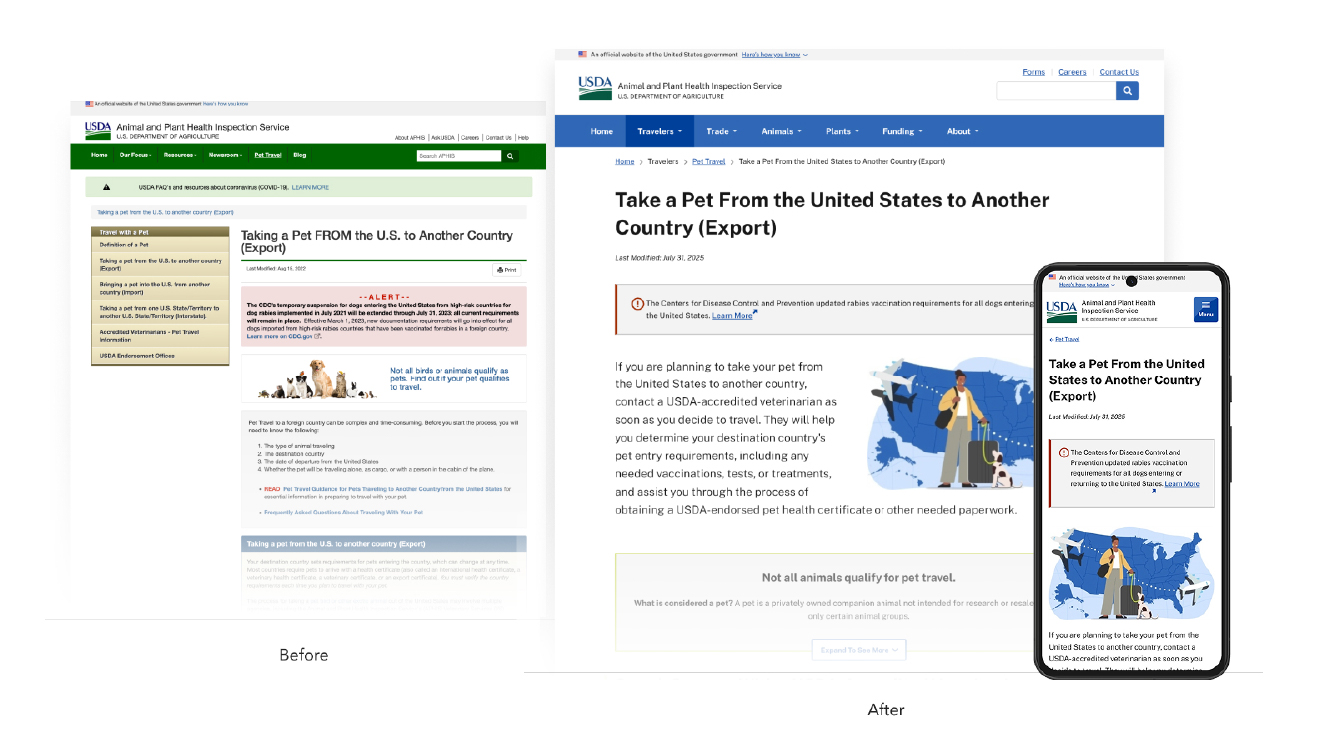 The U.S. Department of Agriculture (USDA) Animal and Plant Health Inspection Service (APHIS) faced a significant digital challenge. Its website—housing critical regulatory information, permit applications, and certification processes for diverse stakeholders—had grown unwieldy. Users struggled to find information, content was often outdated, and the user experience wasn’t optimized for mobile devices.