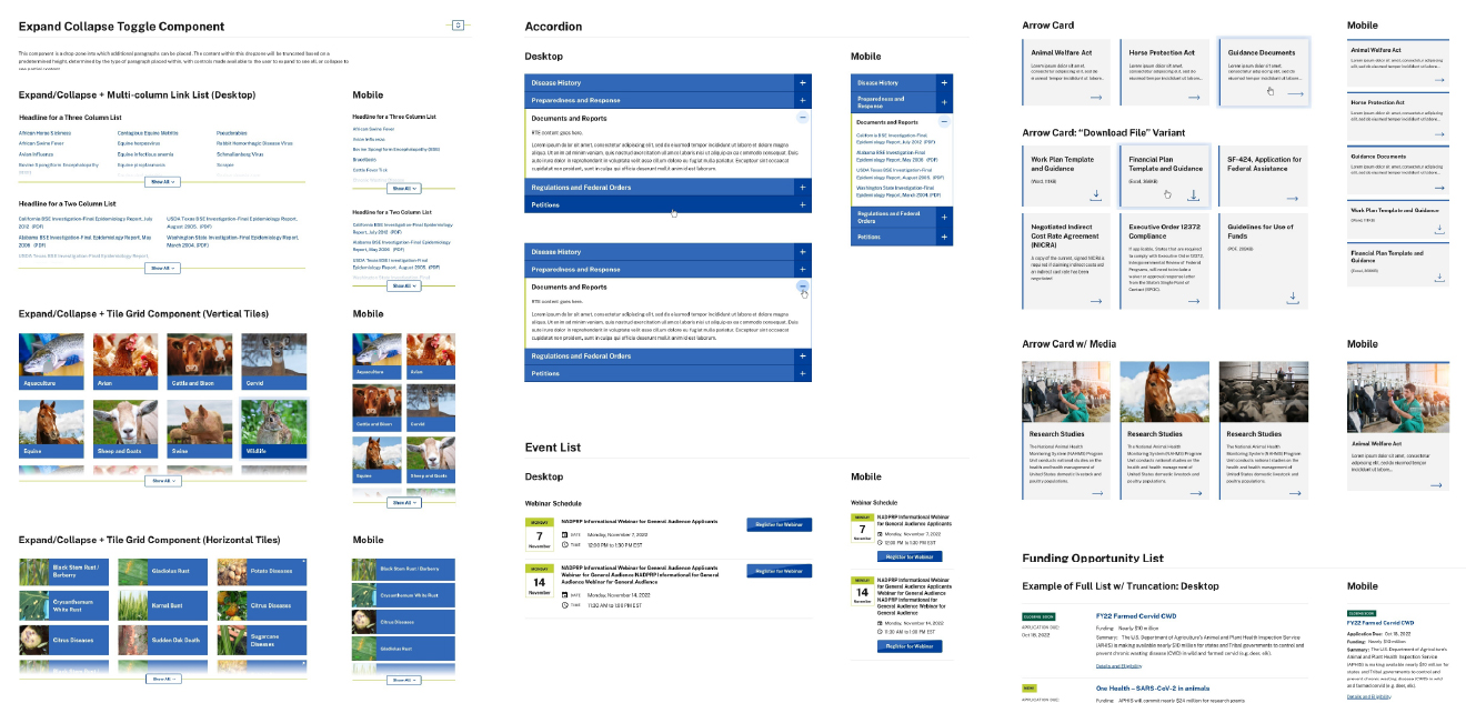 Working closely with APHIS stakeholders, we developed and rigorously tested a new site map and created wireframes to visualize the new content hierarchy and page layouts. Finally, we created a modular design system, based on the United States Web Design System (USWDS), and migrated APHIS’ content from SharePoint to Drupal.