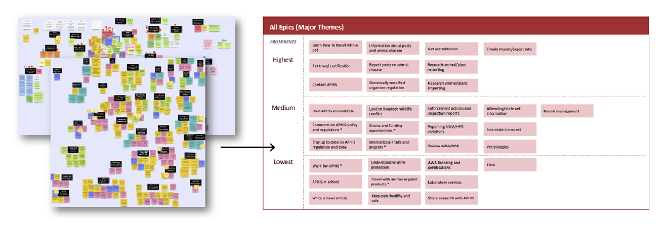 To transform APHIS’ digital presence, we began with user-centered research and discovery. Our team gathered insights about APHIS audiences and how the website could support their needs. We conducted stakeholder interviews, audited over 6,500 webpages, and reviewed analytics and internal site search terms to understand users’ most common tasks and behaviors. Through this assessment, we developed 12 user personas and journey maps, which then guided our design strategy.